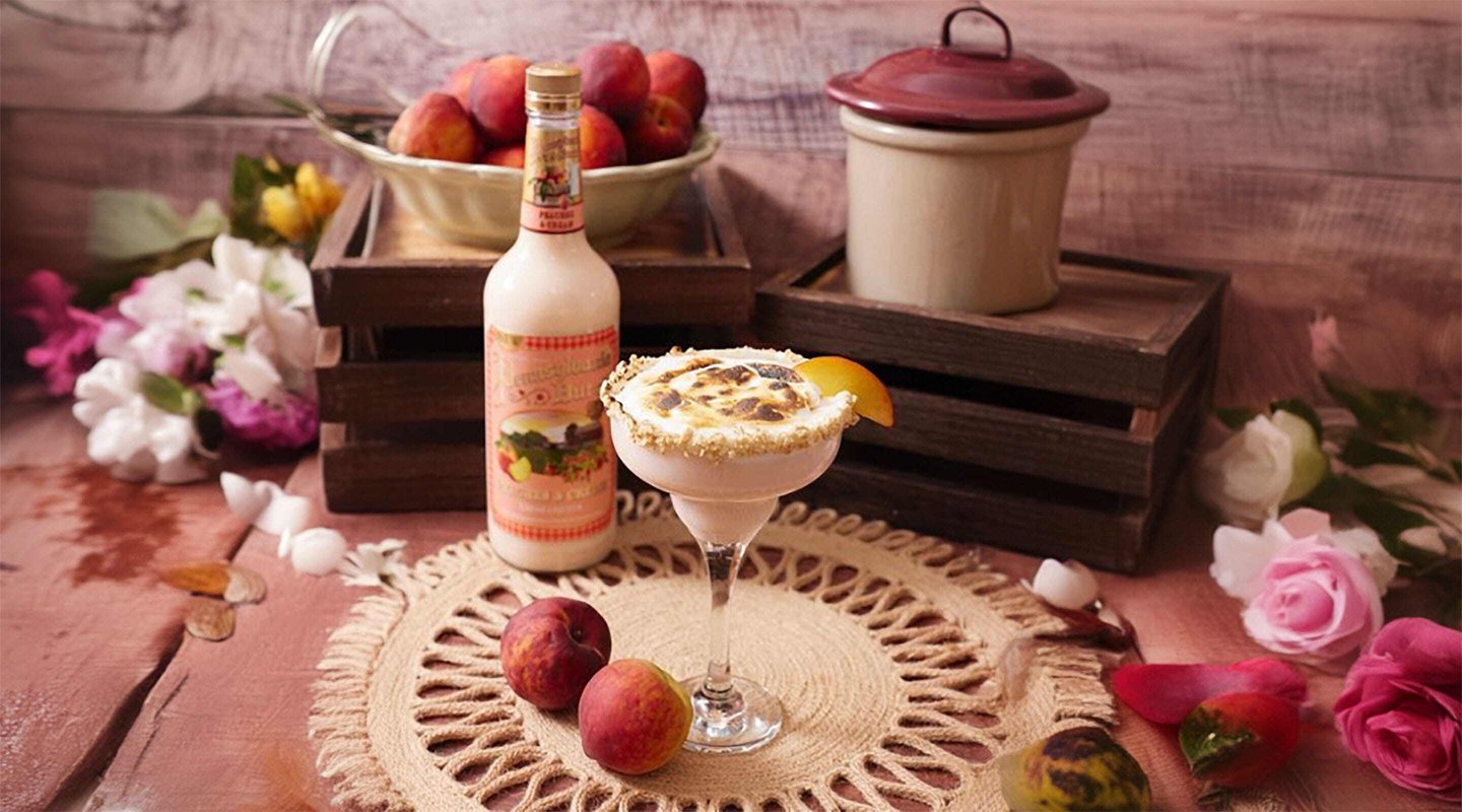 - In a shaker, combine Peaches and Cream Liqueur, bourbon, vanilla liqueur, peach syrup, and a dash of aromatic bitters. Shake well to blend the flavors together.