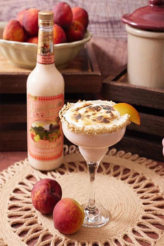 - Garnish the cocktail with a slice of fresh peach and serve immediately while the marshmallow cream topping is warm and toasted.